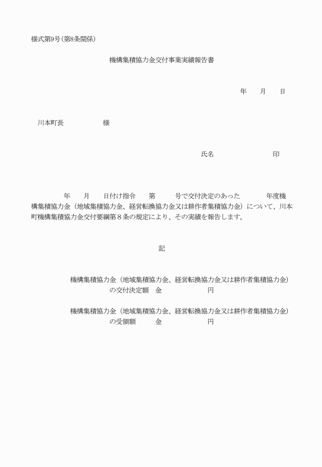第8条 地域又は農業者等は、事業完了の日から1か月を経過した日又は当該年度の3月31日のいずれか早い日(協力金の全額が概算払により交付された場合は翌年度の4月30日)までに、機構集積協力金交付事業実績報告書(様式第9号)を町長に提出しなければならない。
