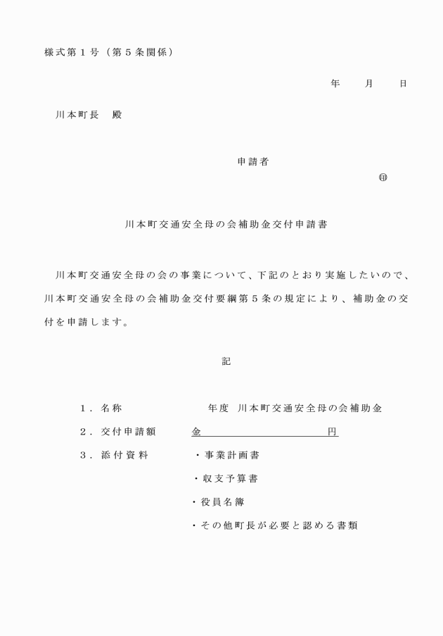 2 概算払により補助金の交付を受けるときは、川本町交通安全母の会補助金請求書(様式第5号)を町長に提出しなければならない。